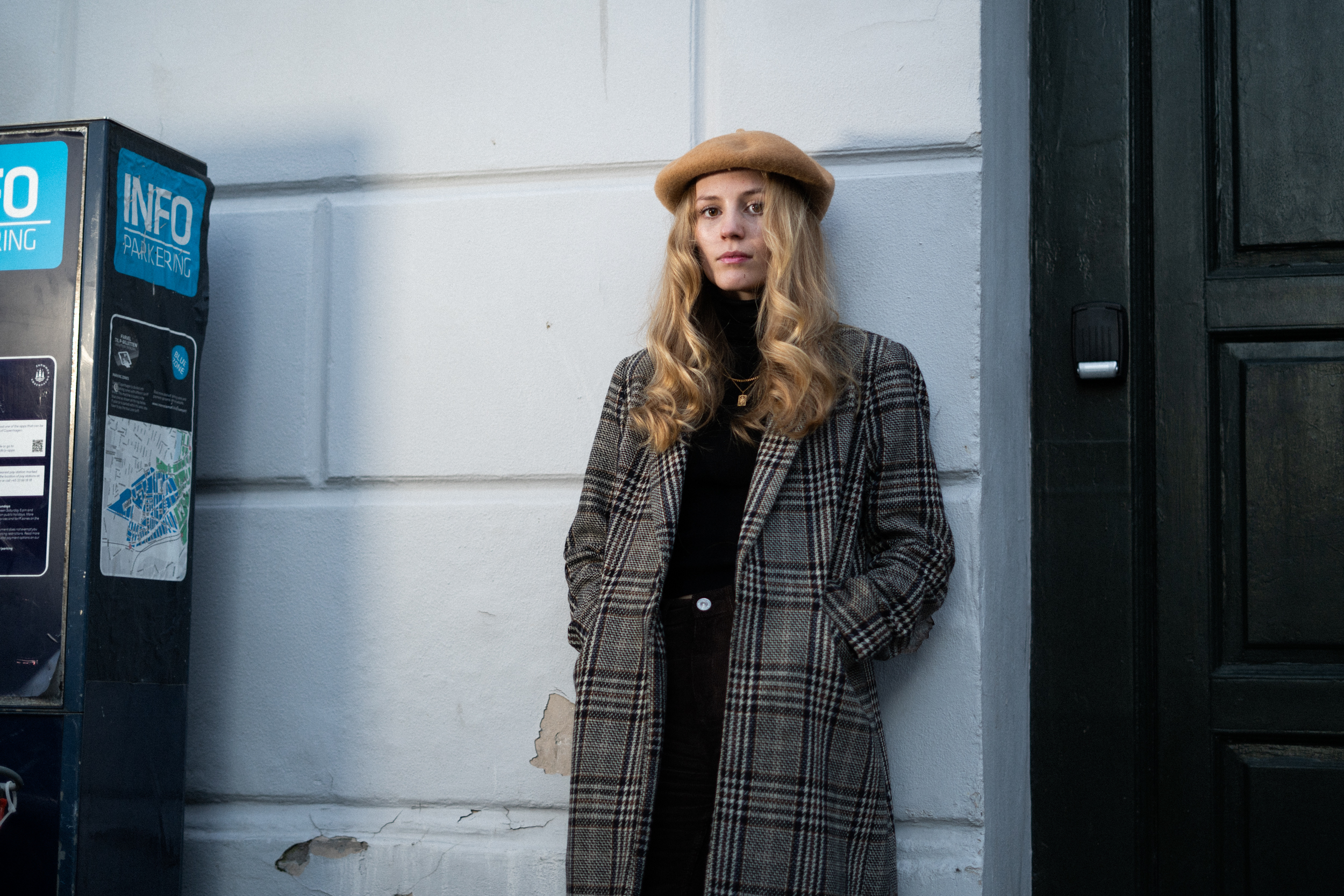 Hun venter ved et lille bord i det allerbageste hjørne på Enghave Kaffe med blikket dybt inde i en computerskærm, afdæmpet klædt i sort rullekrave, brune fløjlsbukser og med en enkelt guldkæde om halsen.