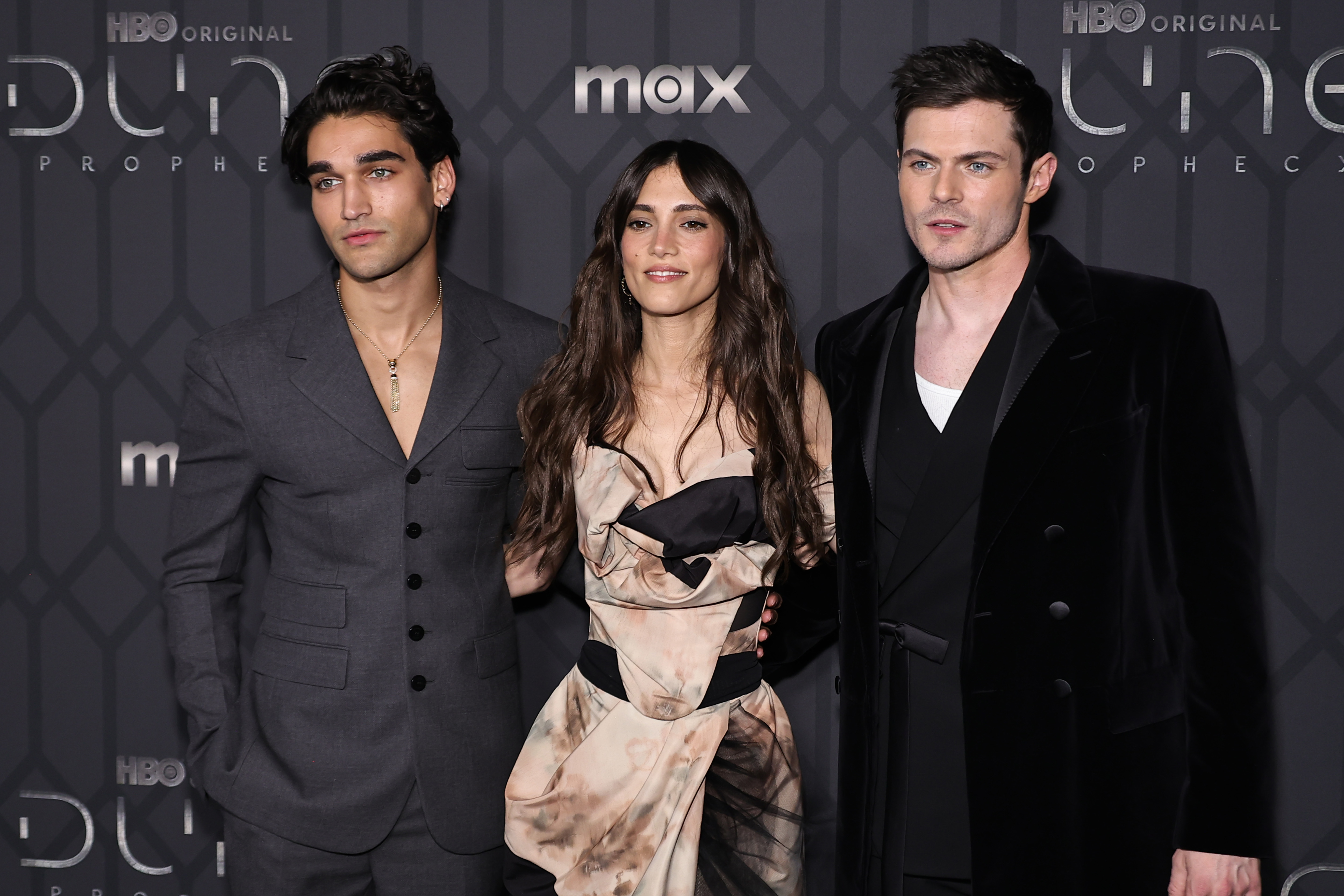 Sarah-Sofie Boussnina flankeret af medskuespillere Josh Heuston og Chris Mason til premieren på ‘Dune: Prophecy’ i New York. (Foto: Theo Wargo/WireImage)