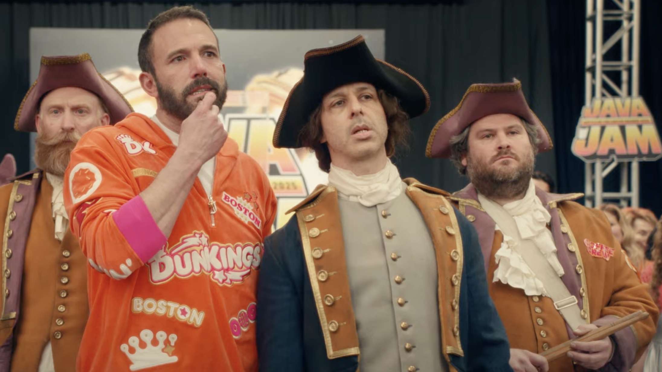 Udover Affleck-brødrene og Strong ses også den legendariske NFL-træner Bill Belichick, Donnie Wahlberg, Kevin Smith og Jason Mewes i den morsomme og ærkeamerikanske reklame.