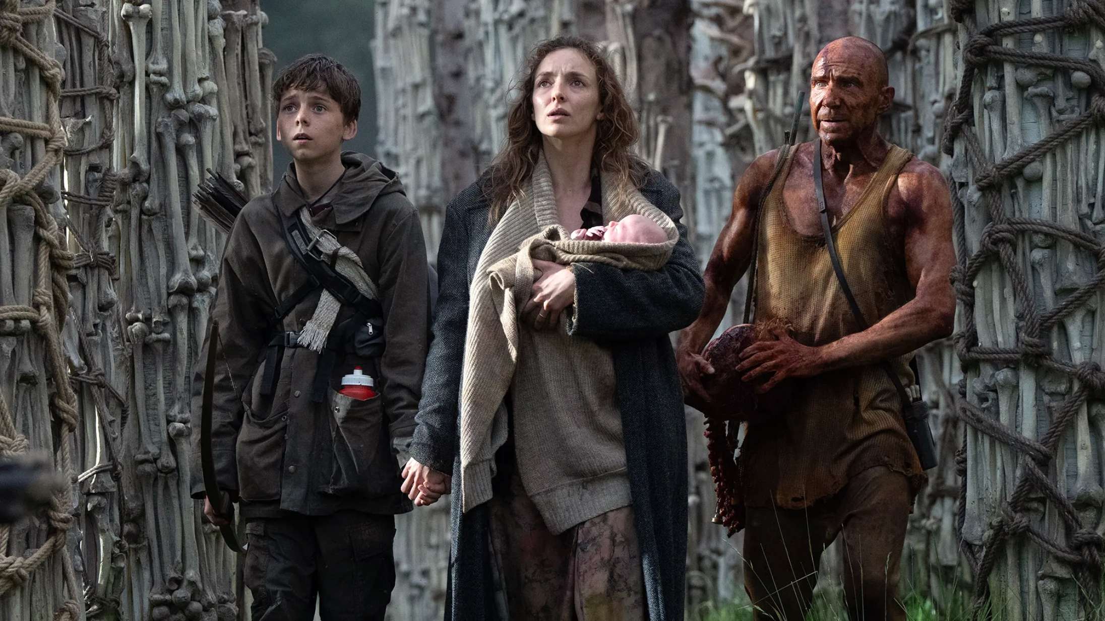 Alfie Williams, Jodie Comer og Ralph Fiennes i '28 Years Later'. (Foto: SF Studios)