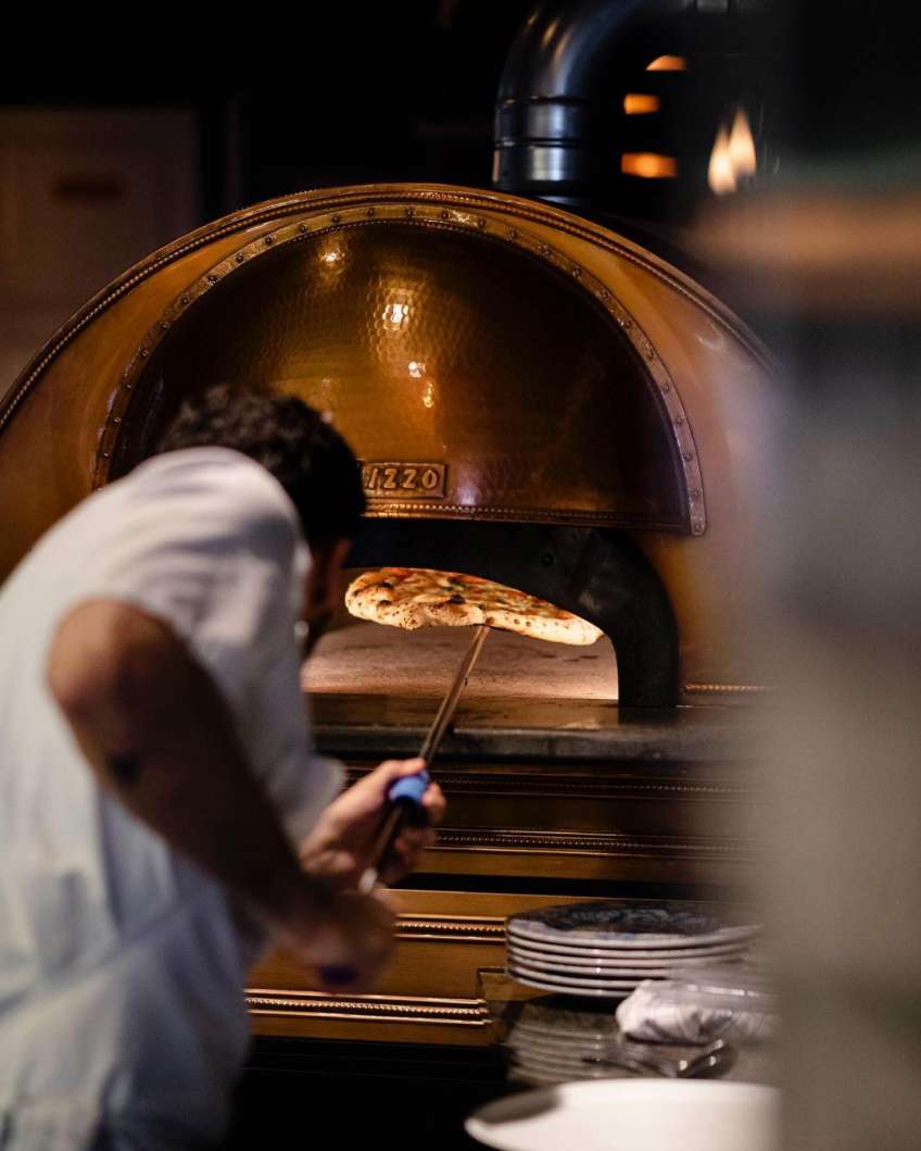 »Pizzaen skal i ovnen i cirka seks minutter, så hvis svampe for eksempel er 15 minutter om at blive tilberedt, så giver vi dem ni minutter først på en pande, før de kommer på pizzadejen og kommer i ovnen. Det skaber mere umami i smagen«, siger Gioacchino, der selv er stor fan af den klassiske pizza Parmigiana.