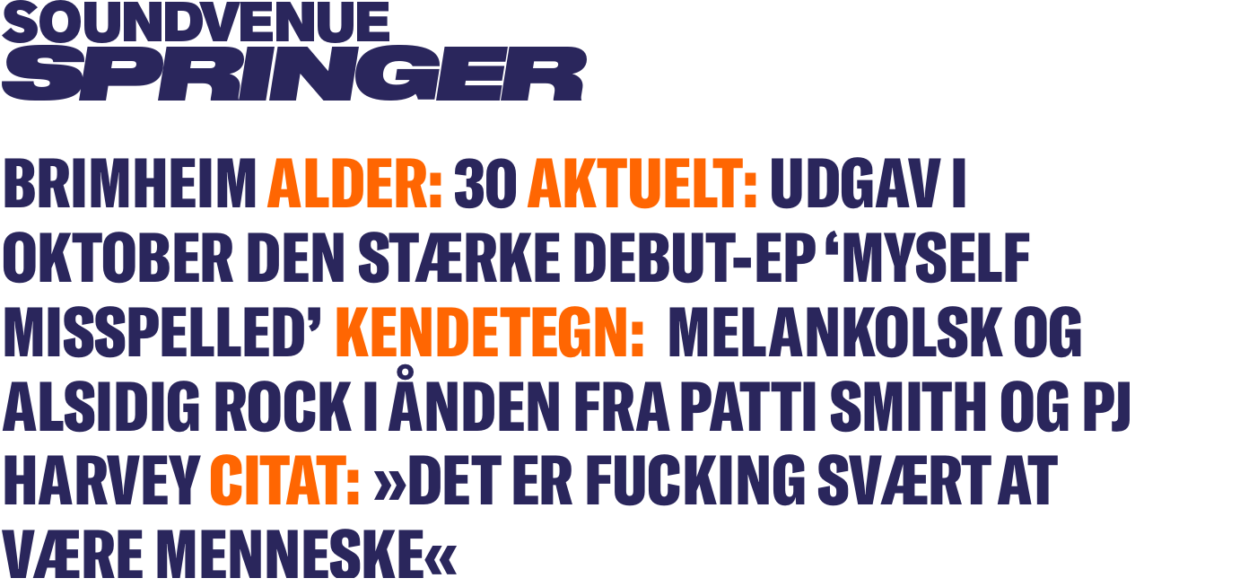 Med Soundvenue Springer sætter vi fokus på de nye talenter, der blæser os bagover lige nu, og som vi glæder os til at følge i mange år frem.