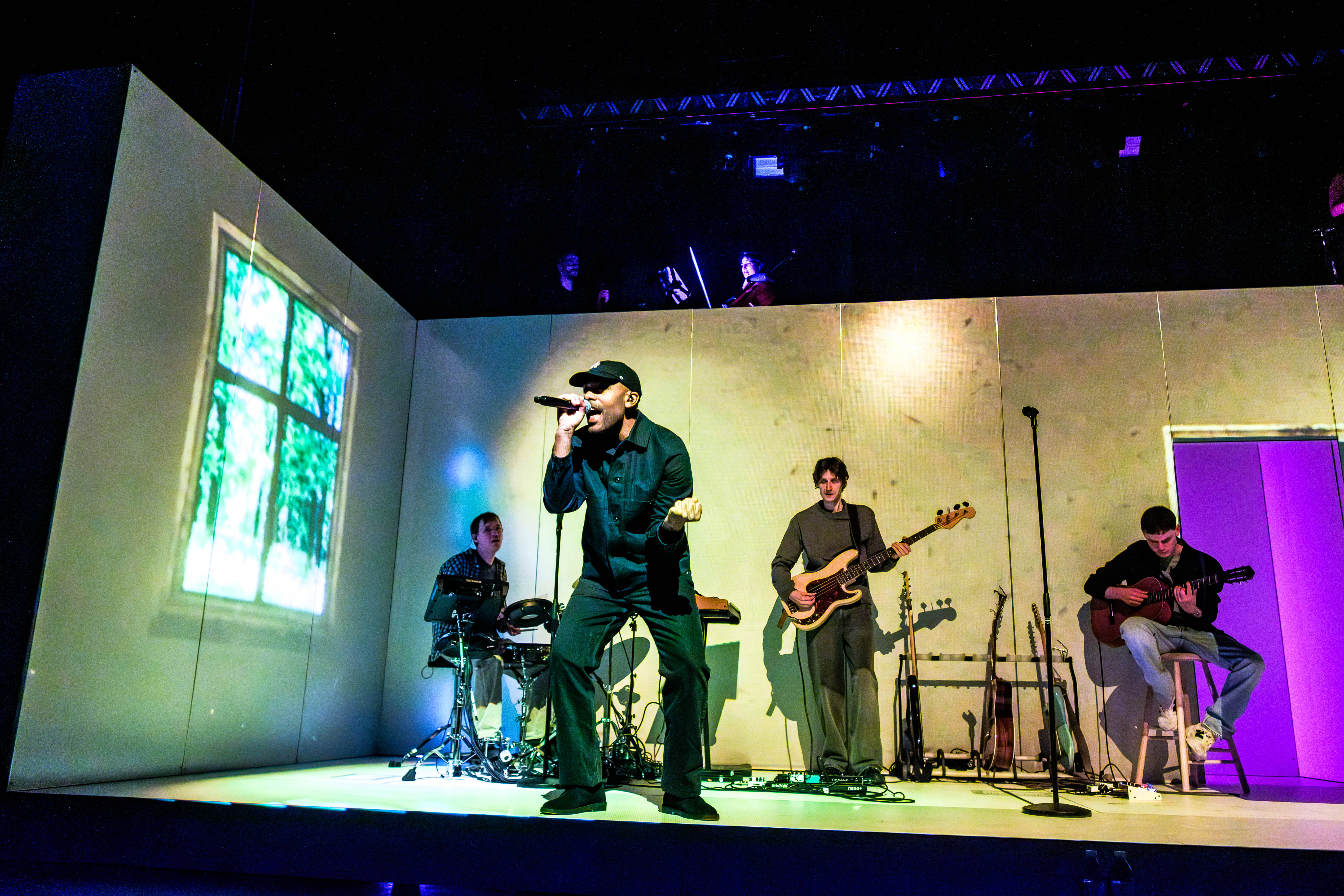 Scenen var minimalistisk og holdt helt i hvidt – som et blankt lærred. Senere blev der projekteret billeder op på væggene bag ham, men det føltes næsten unødvendigt. Hans Philips vokal og bandets lyd farvede allerede rummet og gav scenen liv.